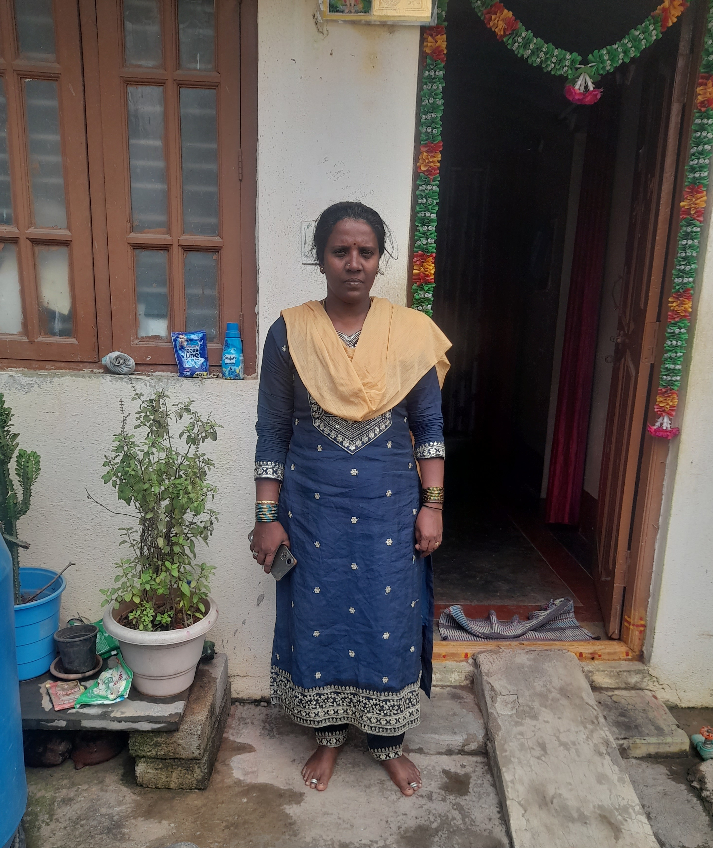 Mala is a dedicated housewife living in Gantiganahalli, Yelahanka, Bengaluru Uttara, with her husband, Jayaram, who works as a daily wager earning ₹300–₹400 per day. Mala does not have children, and together they manage a modest household.